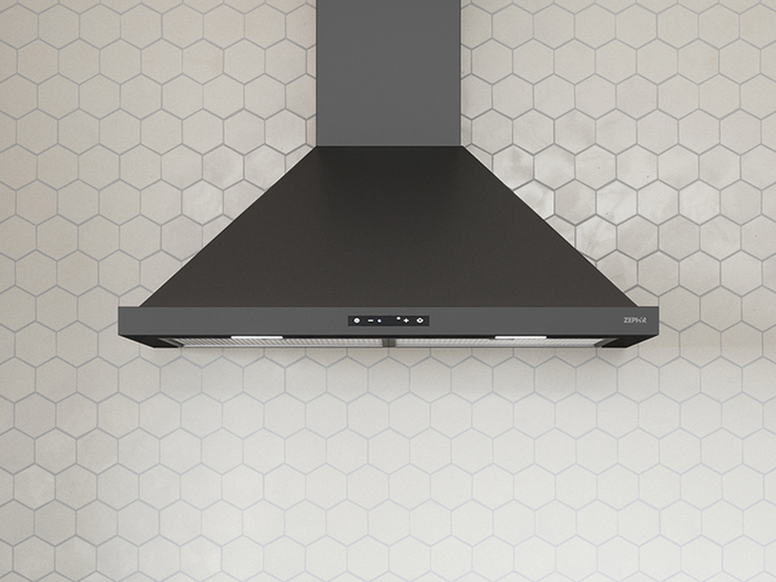 Zephyr ZOME30BBS Mounted on Wall. Ombra Wall features a powerful 600-CFM blower. Pwrfect combination of form and function. Zephyr exclusive Airflow Control Technology (ACT) and meet CSA code requirements. Available in sleek black stainless steel and stainless steel. Duct Cover, Tempest I & II, 48in x 24in